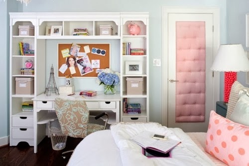 Μια κρεβατοκάμαρα με μπόλικο τυρκουάζ, σε διάφορους τόνους και έκπληξη τα διάφορα έντονα διακοσμητικά. Το μπουντουάρ καθρέφτη, το κεφαλάρι από μπεζ ταπετσαρία, όπως και τα μικρά πουά στον κρεββατόγυρο. Τα δύο ακόμα στοιχεία που θα πρέπει να μας σε αφήσουν αδιάφορες, είναι η καρέκλα λουλουδένια πλάτη-πουά ύφασμα και φυσικά το «Ι love you» στο τοίχο. Ωραία πράγματα…