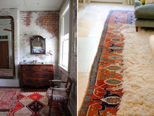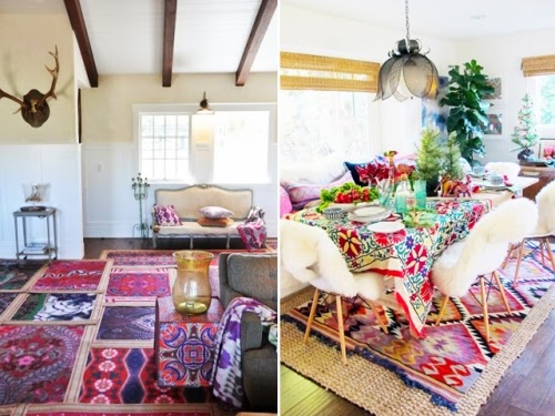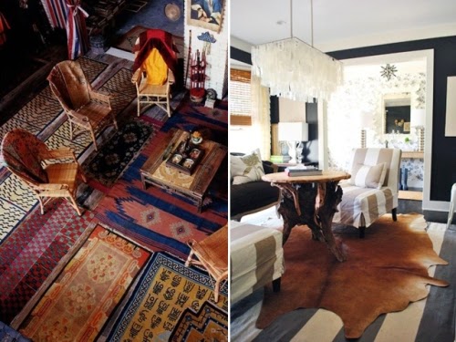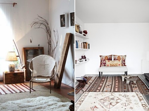 Παίξτε με τα χαλιά, τα υφαντά κιλίμια, τις φλοκάτες και τα δέρματα. Ένα κιλίμι πάνω σε ένα χαλί ή αναμίξετε ένα υφαντό χαλί, με δέρμα προβάτων, ή αγελάδας, όσα περισσότερα τόσο το καλύτερο. Έτσι δημιουργείτε ένα ”συνονθύλευμα” σε style boho. Αποπνέει ζεστασιά και είναι ότι πρέπει για στιγμές χαλάρωσης….