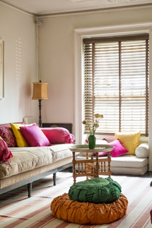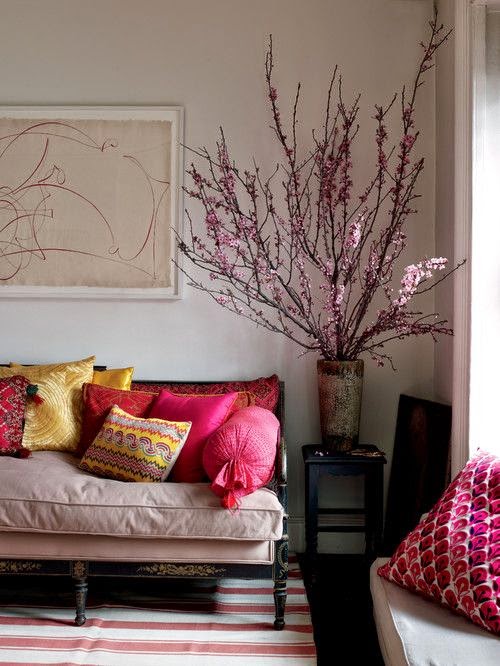 Το Χρώμα στην διακόσμηση, έχει χαλαρωτικές ιδιότητες, προσθέτει ζεστασιά και κάνει την ατμόσφαιρα ευχάριστη!! Ο συνδυασμός του κόκκινου και του ροζ, γίνεται καταπληκτικός με το λευκό!! Τα πορτοκαλί και πράσινα μεταξωτά μαξιλάρια και βαμβακερά στο πάτωμα…..