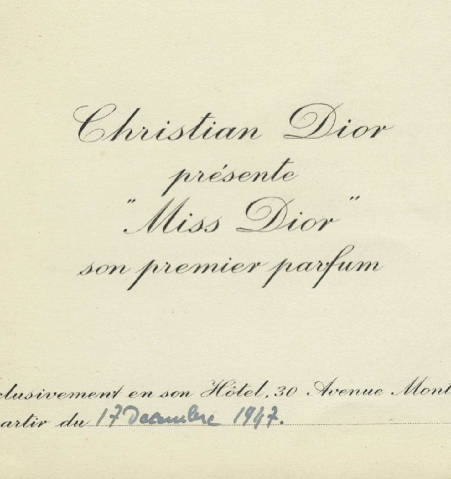 Κατά τη διάρκεια μιας συνάντησης με τη μούσα του, Mitzah Bricard, η Catherine μπήκε στο δωμάτιο. Η Mitzah αναφώνησε αυθόρμητα: “Α, να η δεσποινίς Dior!” (Miss Dior). Ο Christian βρήκε αμέσως αυτό που έψαχνε. Το άρωμα, γεμάτο νότες από τα γιασεμιά και τα τριαντάφυλλα που καλλιεργούσε η αδελφή του, έγινε ο απόλυτος φόρος τιμής στη ζωή και την αναγέννησή της.
