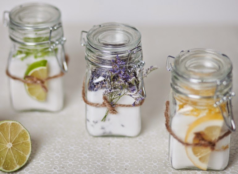 Vierte un poco de azúcar en un frasco y luego haz algunas capas con las hierbas de tu elección.